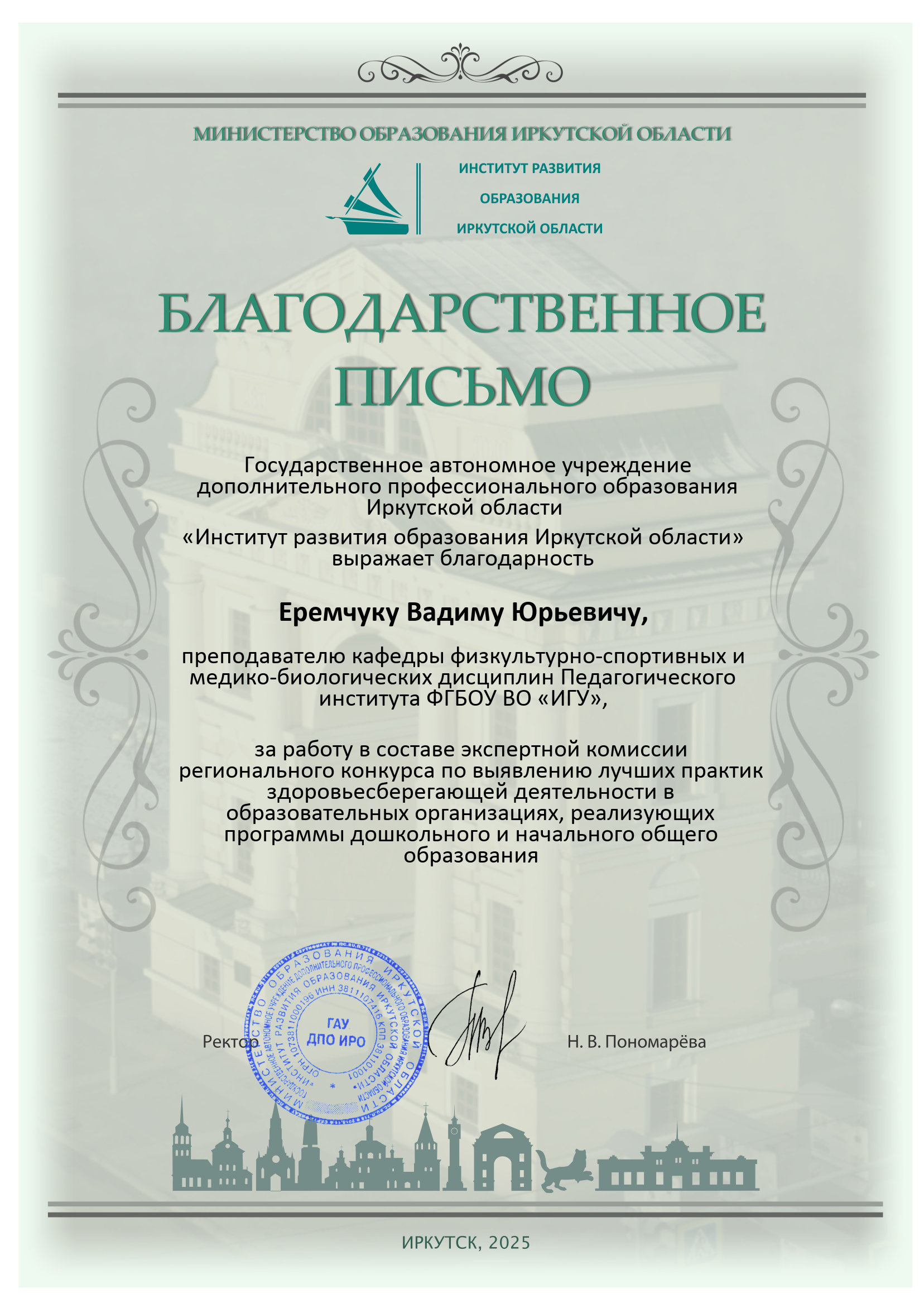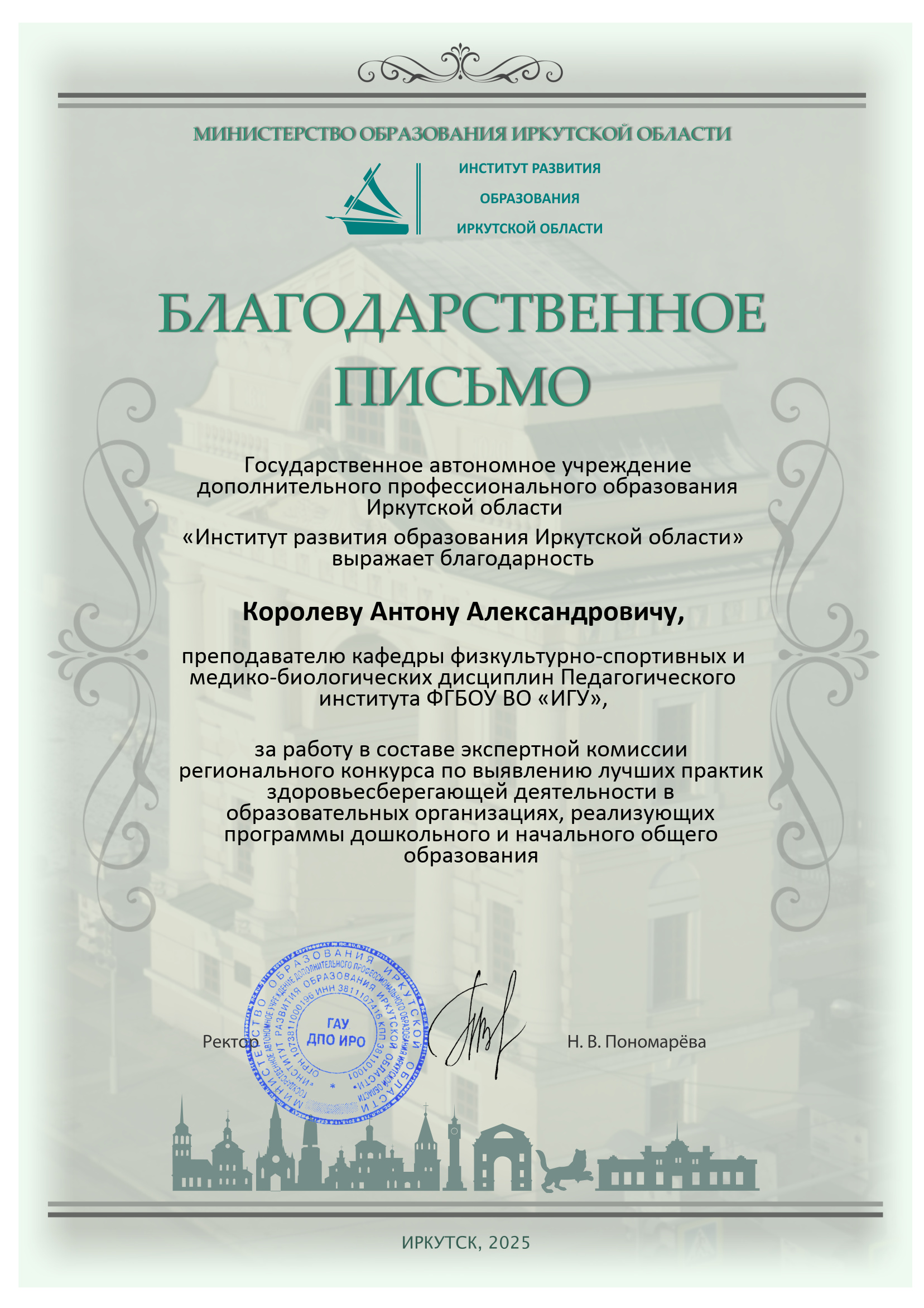 - Благодарственное письмо директора Иркутского регионального колледжа педагогического образования Пружинину К.Н.