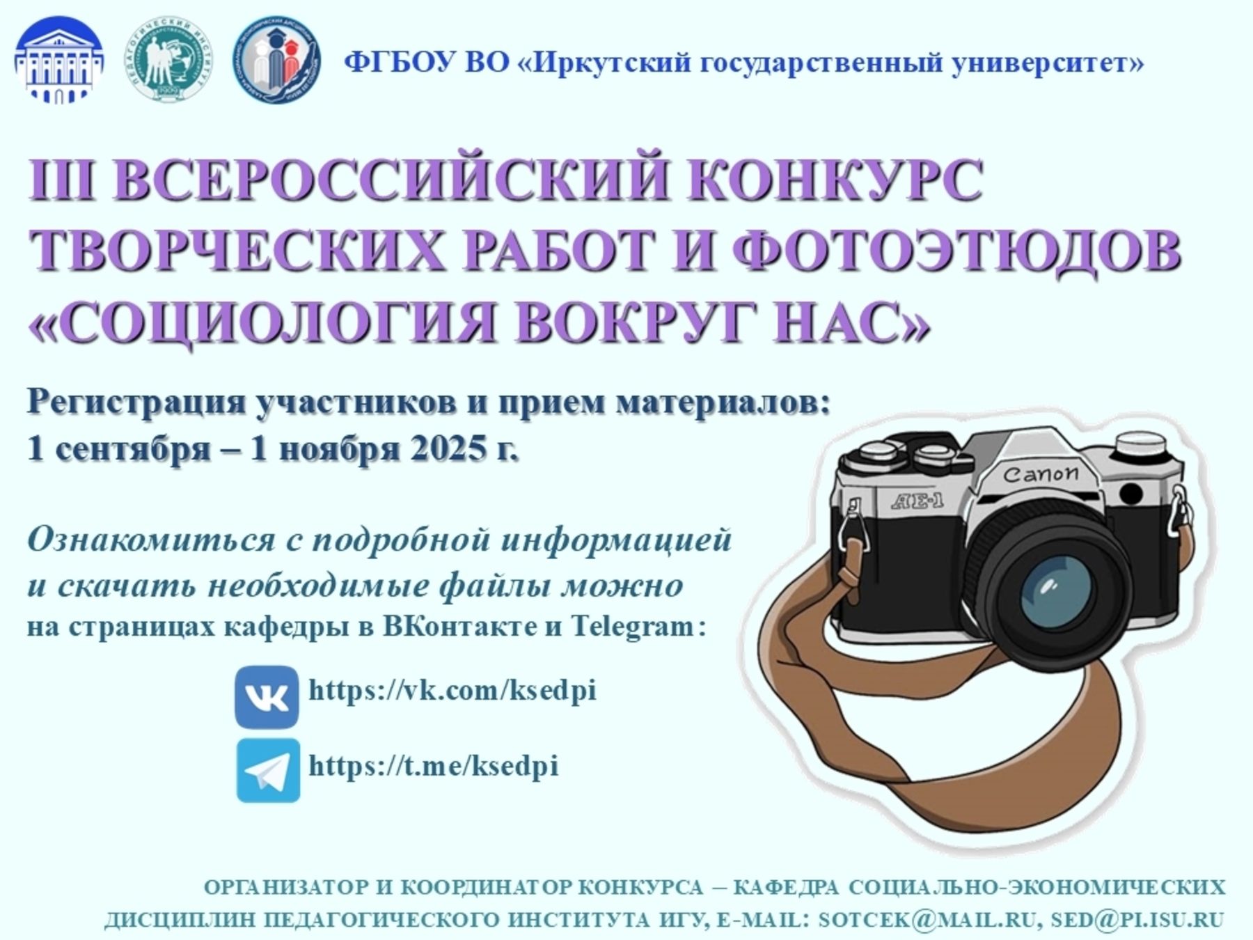 Кафедра социально-экономических дисциплин педагогического института ИГУ приглашает принять участие в III Всероссийском конкурсе творческих работ и фотоэтюдов «Социология вокруг нас».