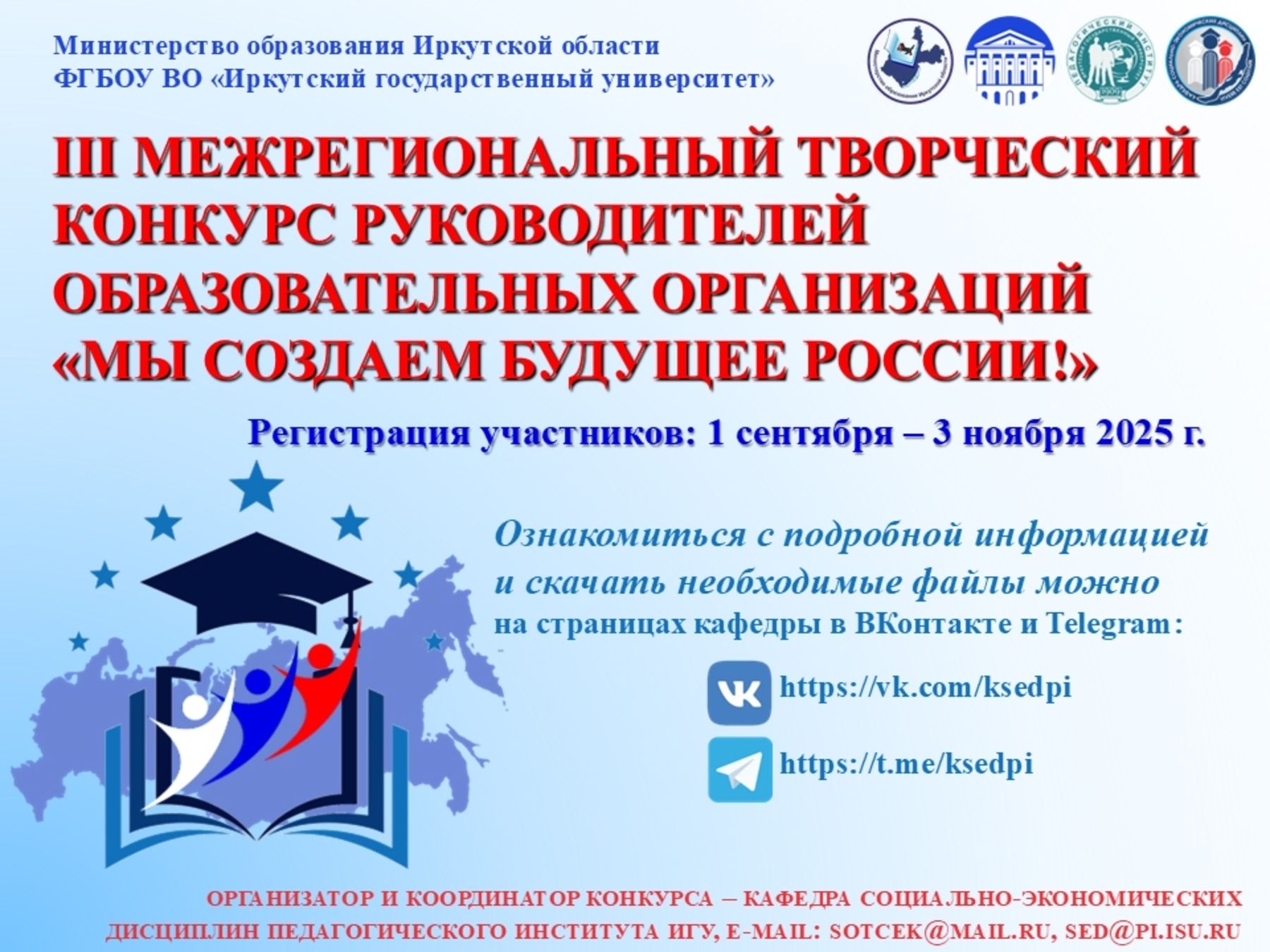 Кафедра социально-экономических дисциплин педагогического института ИГУ приглашает принять участие в III межрегиональном творческом конкурсе для руководителей образовательных организаций «Мы создаём будущее России!».