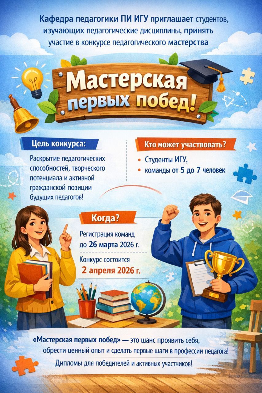 Кафедра педагогики ПИ ИГУ приглашает студентов, изучающих педагогические дисциплины, принять участие в конкурсе педагогического мастерства «Мастерская первых побед»!