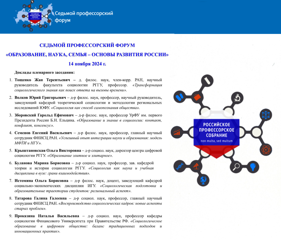 14 октября в России празднуют день социологии. В научном сообществе к празднованию дня социолога приурочено проведение Российского профессорского собрания. Оно проходит при поддержке Министерства науки и высшего образования Российской Федерации, ежегодно собирает на своей площадке более 1500 участников.