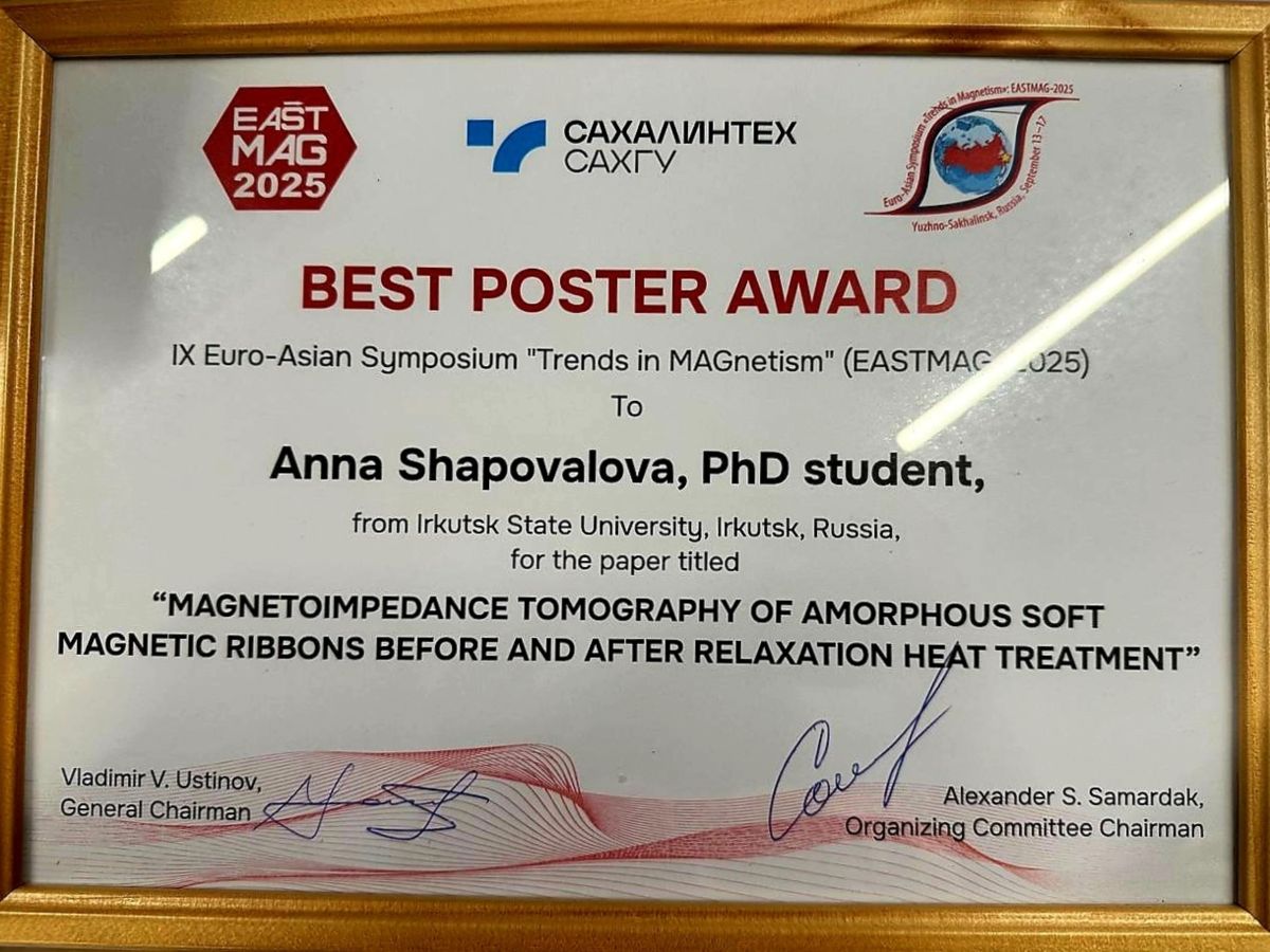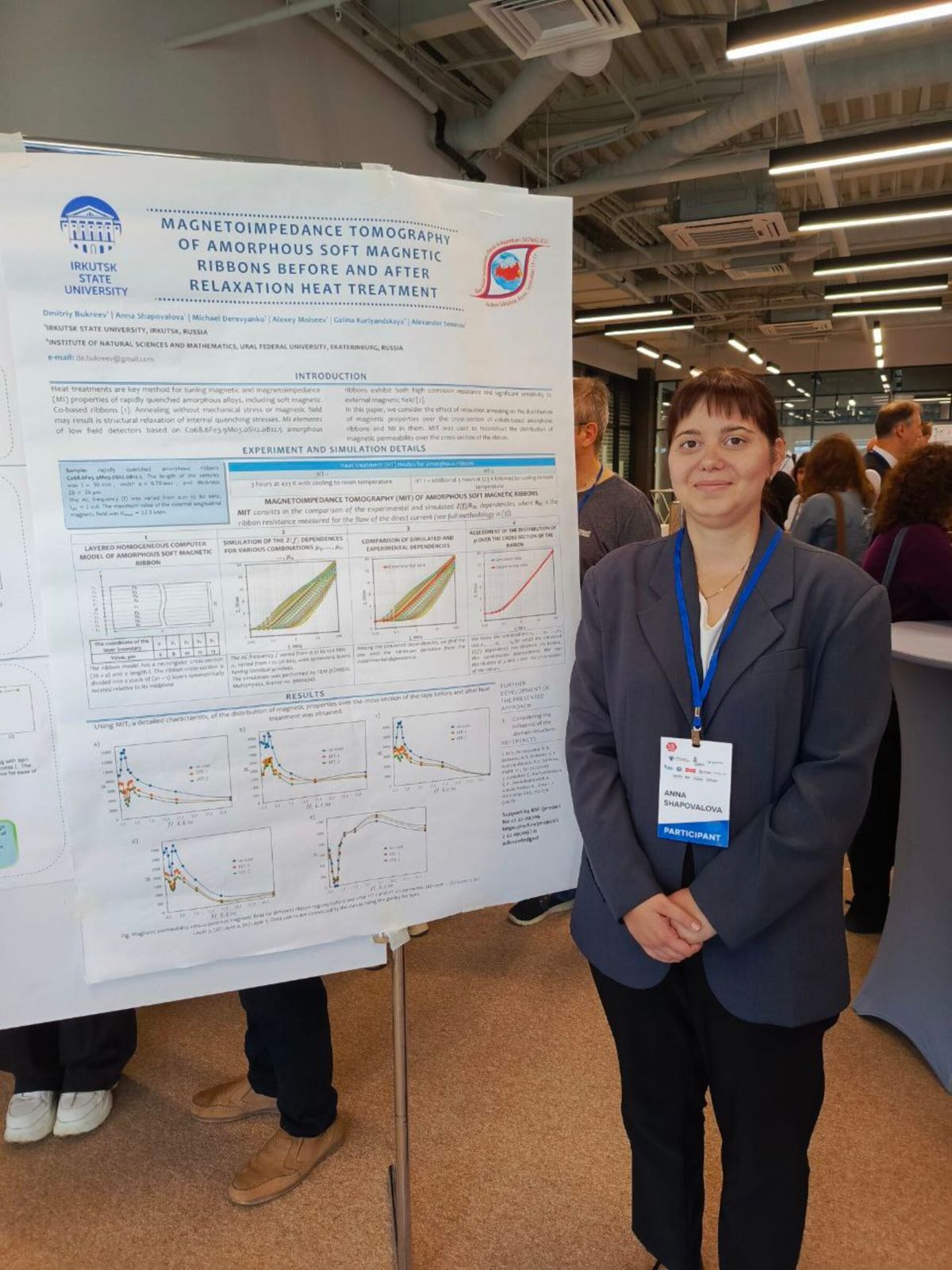 На международном форуме обсуждались актуальные вопросы в области магнитных материалов и технологий. Симпозиум собрал около 300 ведущих ученых из 8 стран. Постерный доклад сотрудников кафедры физики по теме «Манитоимпедансная томография аморфных магнитомягких лент до и после релаксационной термической обработки», который представляла аспирант и преподаватель кафедры Шаповалова Анна Владимировна, стал одним из лучших.