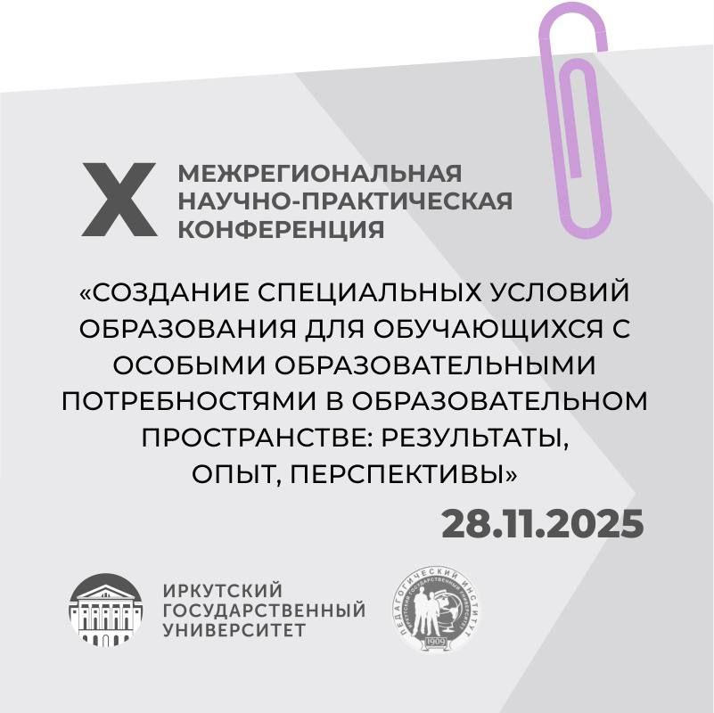 28 ноября 2025 года в Иркутске состоялась X Межрегиональная научно-практическая конференция под названием «Создание специальных условий образования для обучающихся с особыми образовательными потребностями в образовательном пространстве: результаты, опыт, перспективы».