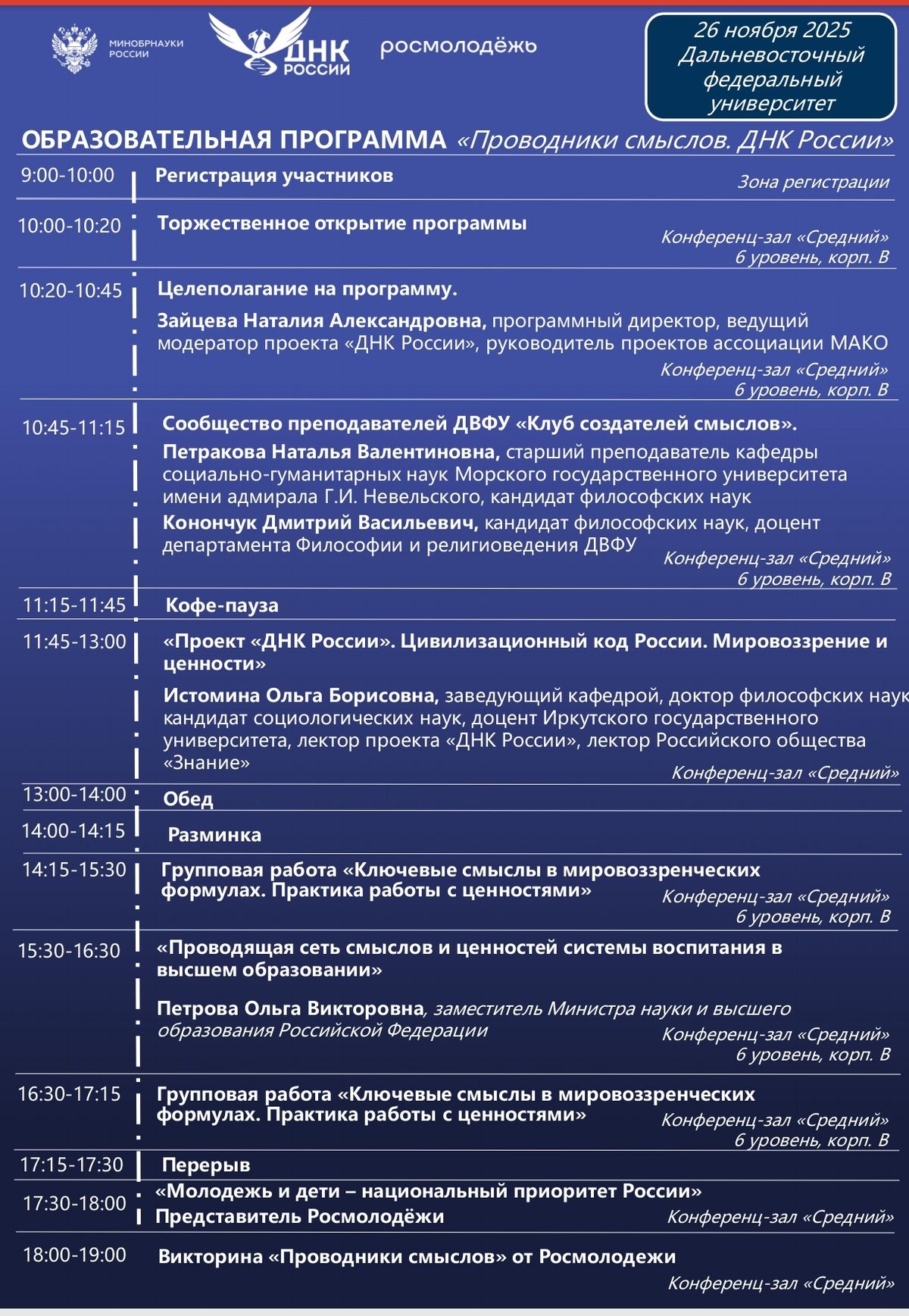 26-27 ноября в Дальневосточном федеральном университете (г. Владивосток) состоялась образовательная программа «Проводники смыслов. ДНК России». Организаторы программы – Министерство науки и высшего образования России, офис ДНК России, Росмолодежь.