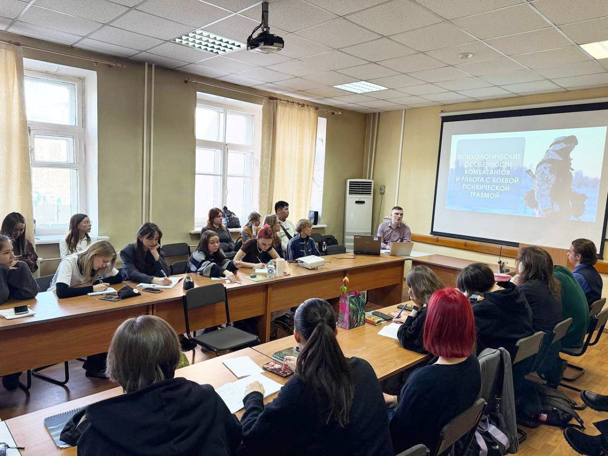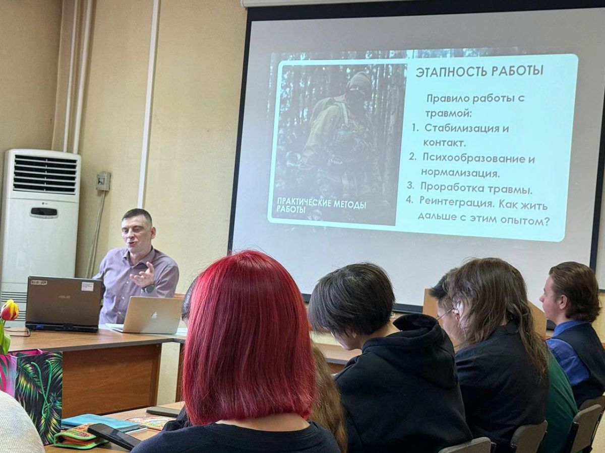 Занятие было проведено в рамках дисциплины "Психология кризисных состояний". У студентов была возможность лично пообщаться со специалистом, работающим с людьми, вернувшимися с СВО.