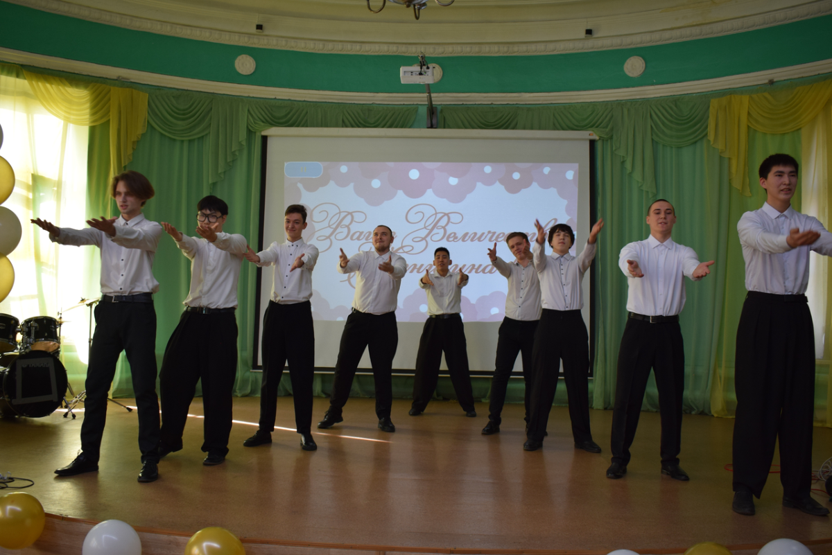 Одним из самых ожидаемых сюрпризов вечера стал номер от преподавателей-мужчин. Их выступление зрители встречали особенно тепло, ведь такие творческие поздравления уже стали доброй традицией. Преподаватели подарили залу много улыбок, искренних эмоций и доказали, что умеют не только преподавать, но и создавать праздничное настроение.