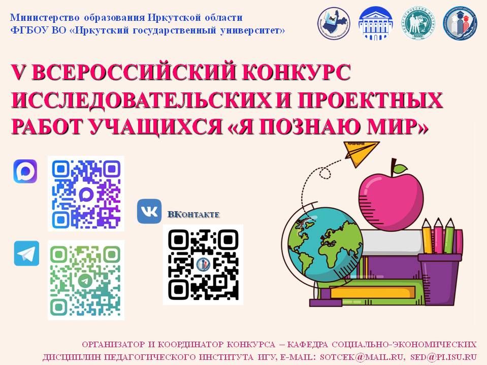 31 марта 2026 г. кафедра социально-экономических дисциплин педагогического института ИГУ подвела итоги V Всероссийского конкурса исследовательских и проектных работ учащихся «Я познаю мир». Конкурс проводится совместно с Министерством образования Иркутской области.